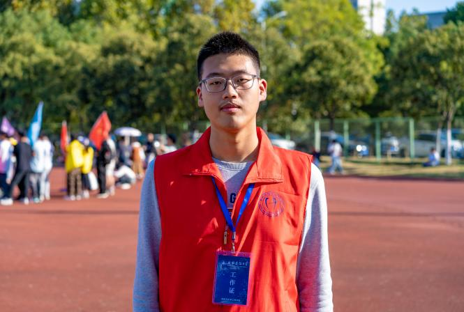 在运动会如火如荼开展的间隙,我们采访到了两位志愿者。守候在终点线旁的崔展豪同学是第一次参加志愿者这份工作。崔展豪同学来自材化学院高分子材料与工程专业,他向我们坦言自己以前很少尝试公共活动。对于他来说,志愿者工作是一个拓宽眼界,培养能力的好机会,最重要的是能为安建大这个大家庭做一些力所能及的事情。在此次运动会中,崔展豪同学主要承担联络员与后勤保障的工作。对于自己负责的运动员,他会在赛场旁时刻关注,并在比赛终点负责接待工作。他与志愿者团队的成员一起,用细心耐心的服务,让运动员无后顾之忧。在上午的100米比赛结束后,两名运动员由于运动强度大,腿软到几乎快摔倒,一瞬间在场的许多志愿者都赶忙上前搀扶,这也是今天让崔展豪同学最感动的瞬间。“我一下子具象地体会到我们学院同学之间的团结与有爱。”他接着说道,“在这里也对所有的运动员和志愿者表示最诚挚的敬意。”天气很热,崔展豪同学依旧坚守在工作岗位上,他的鬓角潮湿,但笑容依旧灿烂。