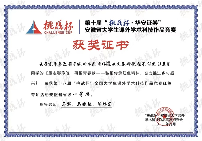 在党的二十大全面推进乡村振兴新部署的方向引导下,在新时代“五育并举”人才培养需求下,延乔青年们积极参与创新创业,在各类赛事中勇创佳绩。从校赛到省赛,他们不断挑战自我、突破自我,从项目核心到计划书、从视频拍摄到路演答辩,延乔青年们坚持打磨、不断凝练,不放过任何一个细节,不忽略任何一个漏洞,他们团结一致、胆大心细;他们吃苦耐劳、知行合一。一个个夜晚的挑灯夜战,一次次会议的头脑风暴,一版版演讲稿的修改完善,一份份调研报告的推翻重来,每一场蜕变都是为了更加完美,每一次坚持都离成功又进了一步。暑期烈日下,青年们迎头奔走,晒得满脸通红;每日7小时电脑前的工作,青年们不惧辛苦,协调时间安排。百般磨练,努力得到了回报,校团委、创新创业学院组织下,在指导老师团队的悉心指导与全程陪伴下,延乔青年团队创作的作品《延乔青年计划——做乡村振兴的实干家》,在第九届安徽省“互联网+”大学生创新创业大赛总决赛中荣获“青年红色筑梦之旅”赛道金奖;《重走鄂豫皖,再扬青春梦——弘扬传承红色精神,奋力推进乡村振兴》,荣获第十八届“挑战杯”全国大学生课外学术科技作品竞赛红色专项活动安徽省省级一等奖。同时团队视频作品也在2023年“新时代·新思想·新青年”安徽省大学生学习马克思主义理论成果大赛中,荣获安徽省级一等奖。