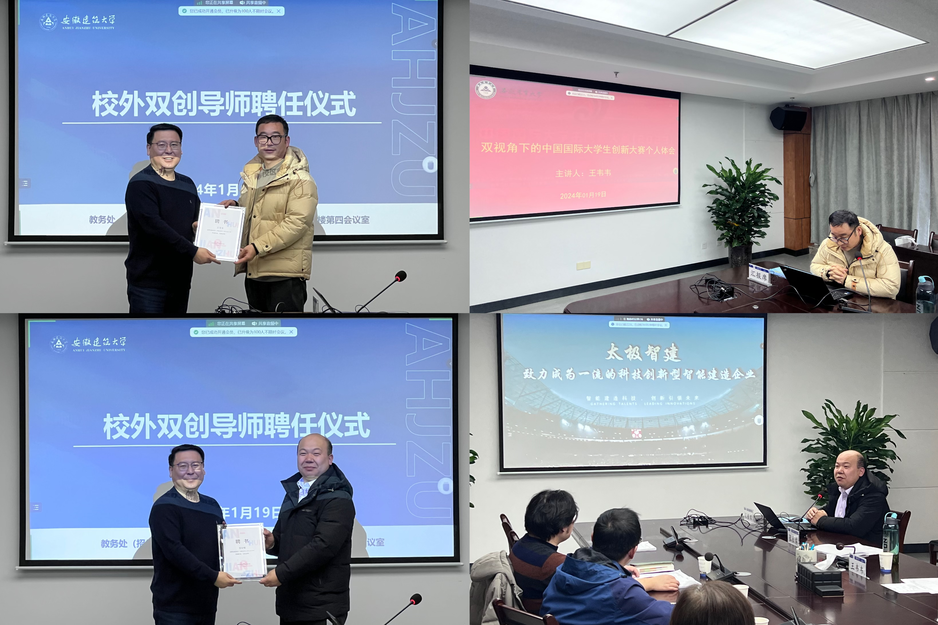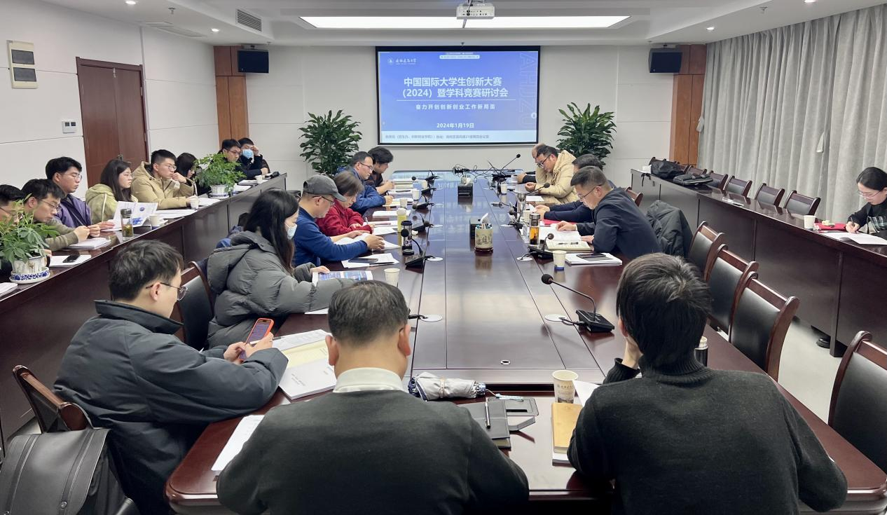 本网讯 2024年1月19日,2023年度学科竞赛总结及发展研讨会在南校区徽风楼21楼第四会议室顺利召开。安徽农业大学王韦韦、安徽工业大学张辰啸两位中国国际大学生创新大赛(原中国国际“互联网+”大学生创新创业大赛)国赛金奖第一指导教师受邀参加研讨并分享指导经验,创新创业学院、校团委、2023年“互联网+”省金指导教师代表、11个本科生学院双创工作代表、学生代表等参加了本次研讨会。研讨会由教务处(招生办、创新创业学院)副处长丁超主持。